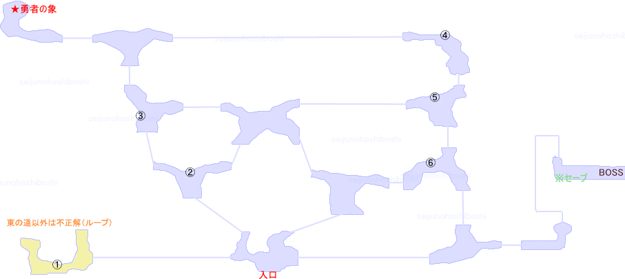 ・来た道を戻ると入口のエリアへ戻される。 ・黄色いエリアは、東以外の道を通ると同エリアに戻ってくる。 ![]() | ||||||||||||||||||||||||||||||||||||||||||||||||||||||||||||||||||||||||||||||||||||||||||||||||